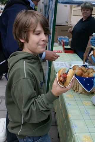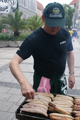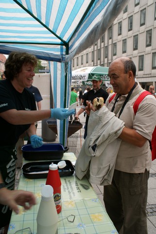 Der Wettergott hatte ein einsehen: Bei schönem Wetter hat am 15. August der Sherpa Fonds in der Münchener Fußgängerzone wieder Thüringer Rostbratwürste zu Gunsten der Kinder in Nepal verkauft.